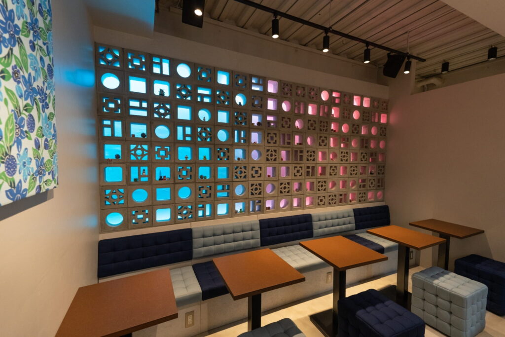 沖縄独自の建材である「花ブロック」は、機能性とデザイン性を兼ね備えた優秀なアイテムです。 風を通し、直射日光を遮りながら、時間によって変化する「美しい影」を店内に落とします。